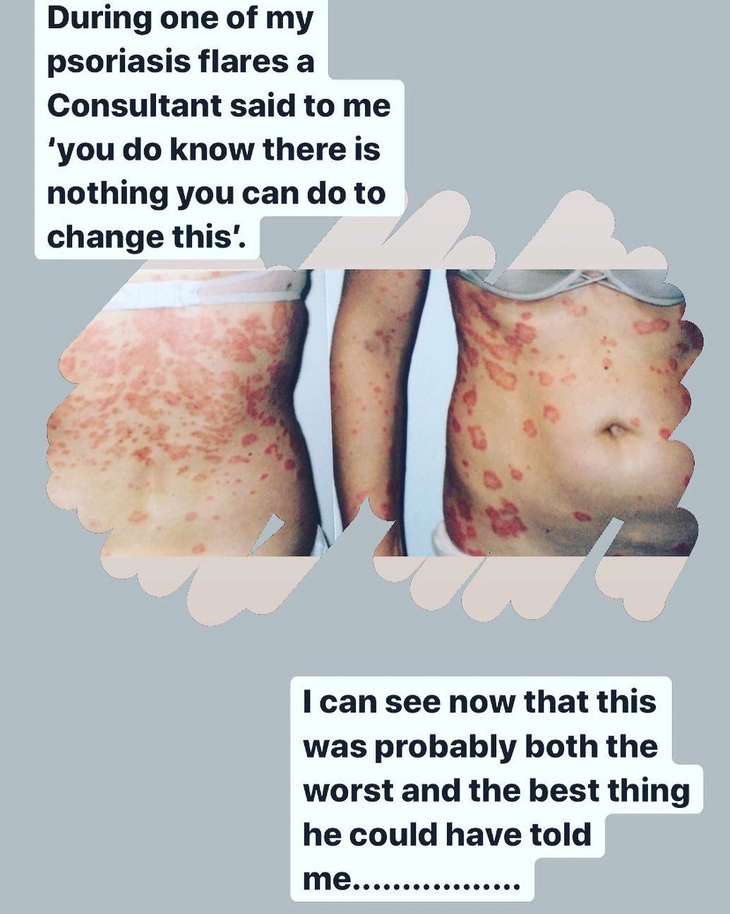 I have always had plaque psoriasis since a young age. At the start of my teens when you desperately want to blend in with the rest of your peers I experienced the most horrendous flare of guttate psoriasis. Smelly creams, steroids, hospital admissions, immunosuppressants followed .....................